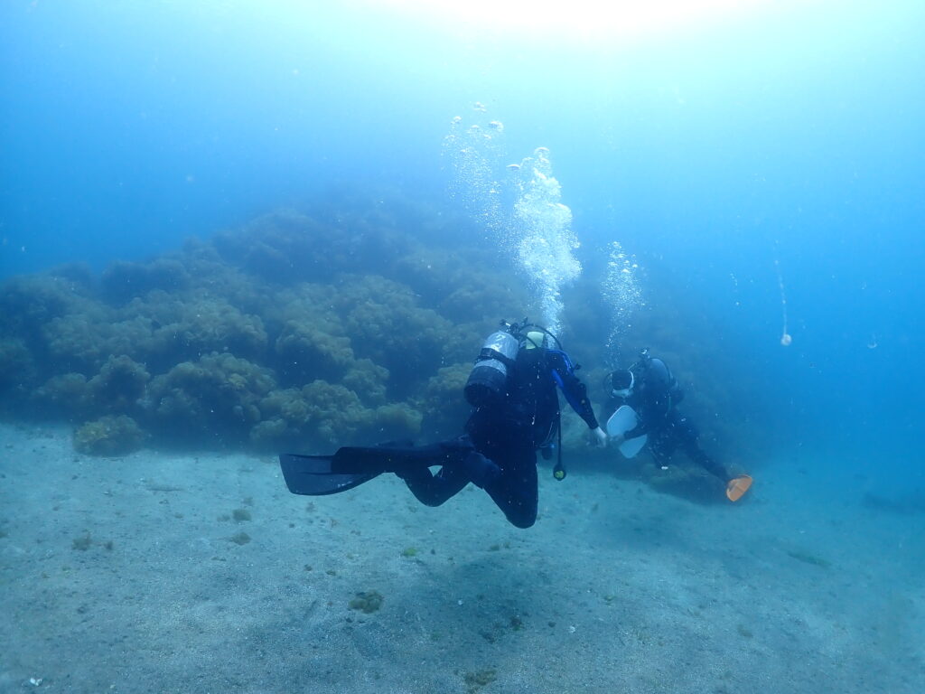 初日はドライで安定しないこともあったので、最初は体験ダイビングの様に遊んでいました。2本目以降でいつもの手順ですね。呼吸、耳抜き、水底に着底。レギュクリア、マスククリア、レギュレーターリカバリー。その後は中性浮力で、泳ぎ回る練習です。