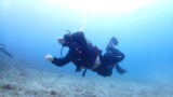 右側がフィンピボットで見ているフトさん。おのっちがウエイト捨てて、スイミング浮上を見せています。ドライスーツでの講習ですが、「水底との距離を1m」を永遠に繰り返す1本を入れるだけで、フィンピボットを含め全てができるようになります。フィンの裏で立ってるのは内緒です。