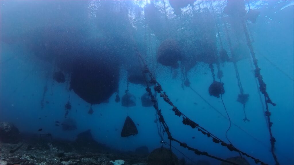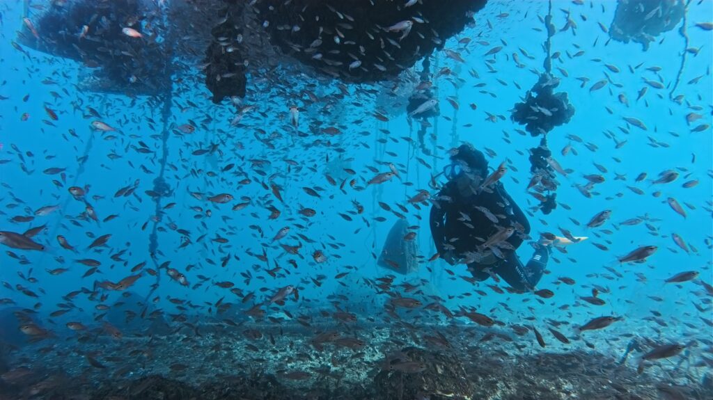 船の周りにはクロホシイシモチが群れていたり、中にはイセエビが隠れていたりします。
